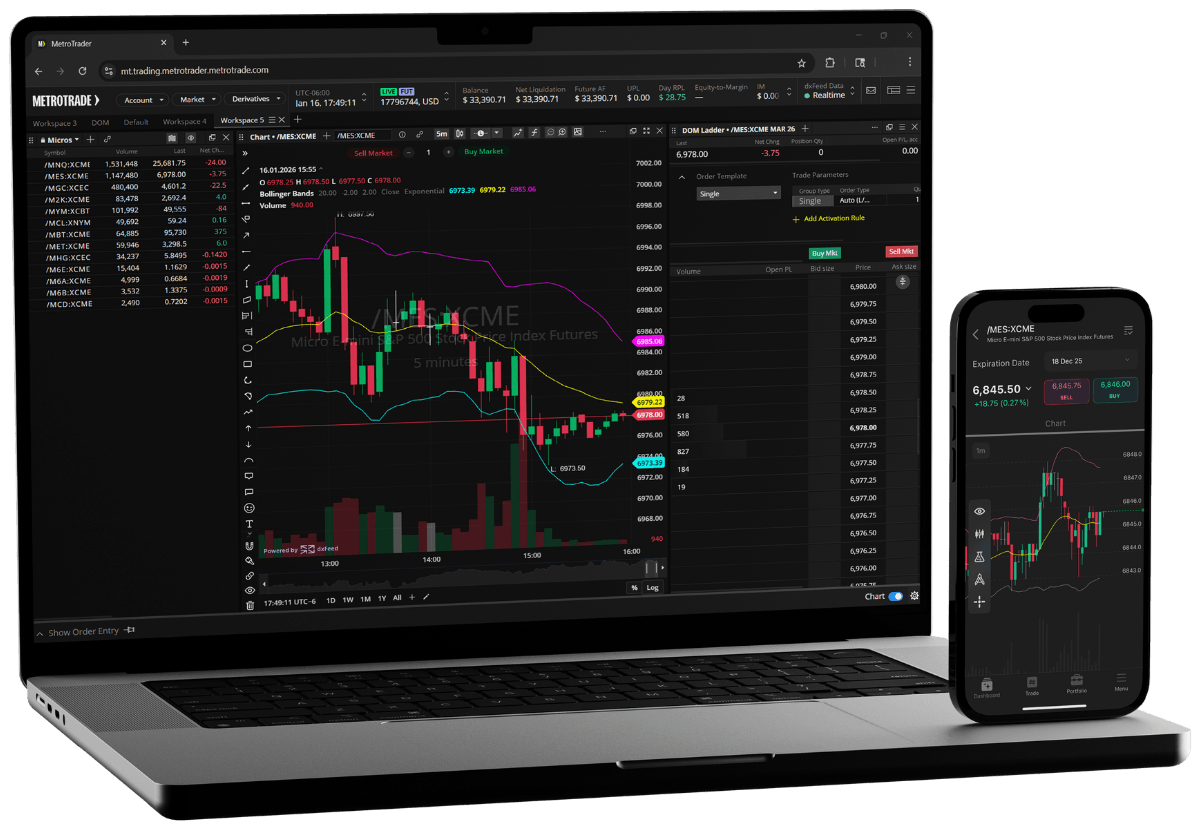 MetroTrader is available as a web platform and a mobile app. Both give you access to your full account, live market data, and order entry tools.