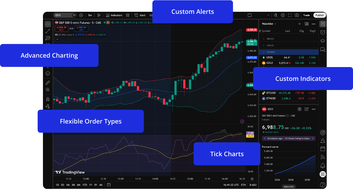 Trade futures using TradingView’s in-depth charting and analysis tools.